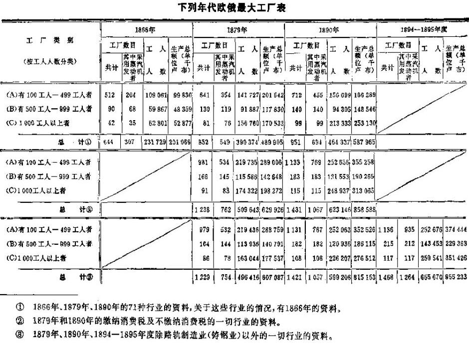 在制革业方面(1866年有企业2308个,工人11463名,生产总额为1460万卢布;1890年有企业1621个,工人15564名,生产总额为2670万卢布),统计经常把工厂和小企业混在一起。这一行业的材料价格较高,生产总额必然也高,而需要的工人很少,因此要区分手工业企业和工厂企业就特别困难。1890年,所有工厂(1621个)中生产总额不满2000布的只有103个;1879年,所有3320(50)个工厂中生产总额不满2000卢布的有2008个;1866年,在2308(51)个工厂中,生产总额不满1000卢布的有1042个(这1042个工厂有工人2059名,生产总额为474000卢布)。可见,工厂数目增加了,虽然工厂统计表明工厂数目减少了。小制革企业现在也很多:例如,根据财政部出版的《俄国工厂工业和商业》(1893年圣彼得堡版)统计,手工业工厂约有9500个,工人21000名,生产总额为1200万卢布。这些“手工业”企业比60年代列为“工厂”的企业要大得多。由于不同省份、不同年代小企业列为“工厂”的数目都不同,所以必须更加谨慎地对待这一行业的统计资料。根据蒸汽发动机的统计,在这一行业中,1875―1878年有使用机器的企业28个,蒸汽机33台,共488马力,而在1890年有使用机器的企业66个,蒸汽机82台,共1112马力。在这66个工厂中,集中了5522名工人(占工人总数1/3强),生产总额为1230万卢布(占总生产额46%),所以生产的积聚是很高的,最大企业的劳动生产率也比平均生产率高得多。(52)
