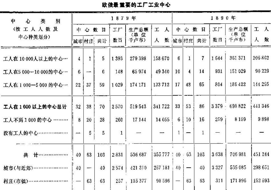 1908年(俄罗斯66省) 工厂数目―工人人数 [工厂类别] 5403―63954 [工人在20以下者] 4569―152408 [21―50工人者] 2112―15 0888 [51―100工人者] 2169―496329 [101―500工人者] 433―28 0369 [501―1000工人者] 299―66 3891 [超过1000工人者] 14985―1808109 [共计] 工厂有100工人以上者 1908年 1903年 工厂数目 工人人数 工厂数目 工人人数 2901―1440859 2737―1261363 |