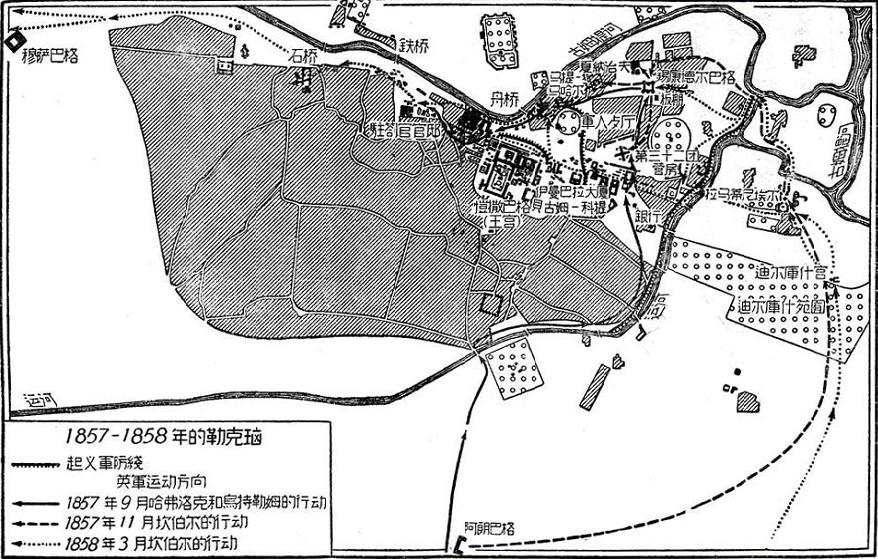 勒克瑙城位于古姆提河右岸,该河在这个地区是顺东南方向流的。在离河2—3英里的地方,有一条几乎与它平行的运河,运河穿过城市,在城市下方逐渐靠近古姆提河,在离城约1英里的地方流入该河。在古姆提河两岸没有人群熙攘的街道,只有一些宫苑和个别的公共建筑。在运河和古姆提河汇合的地方,在它们的右岸即南岸,拉马蒂尼埃尔学院和迪尔库什宫苑并肩而立。在运河的另一岸,但仍在古姆提河的南边,紧靠着河岸,首先是锡康德尔巴格宫苑,再向西是兵营和军人餐厅274,然后是马提-马哈尔(珍珠宫),它距离驻劄官官邸只有几百码远。驻劄官官邸矗立在这一带唯一的高地上,它瞰制全城,有高墙围护,内有几座宫殿和附属的房屋。这些建筑物以南就是人烟最稠密的市区,再向南2英里是阿朗巴格宫苑。