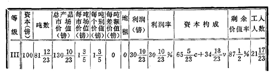 如果产品总价值[在花费资本100镑时]=123+(17/21)镑,而Ⅲ的每吨的个别价值=1+(3/5)镑,那末,这一等级的产品现在是多少吨呢?是77+(8/21)吨。剩余价值率是[62+(1/2)]%。