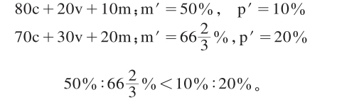 (c)如果e大于E,也就是说,如果可变资本比总资本按更大的比率增加,利润率就会提高。如果80c+20v+20m变为120c+ 40v+40m,利润率就会由20%增加到25%,因为在m′不变时,