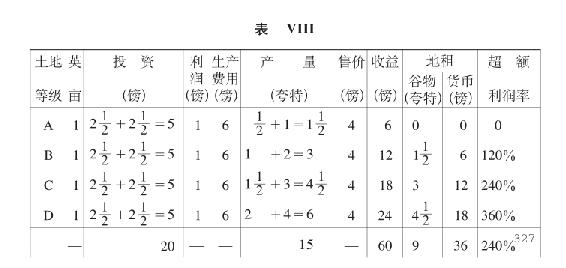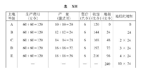 总地租下降到低于第一次投资的地租水平(表XI)的情形,只有在下述情况下才是可能的:A级土地和B级土地都退出竞争,C级土地起调节作用并且变为无租土地。