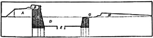 图2所示的断面图可以使上面的介绍更为清楚。A——要塞核心部分的架炮垒道;B——胸墙;C——内岸的石砌部分;D——护城壕;E——水壕,即沿护城壕中央挖掘的较小和较深的壕沟;F——外岸的石砌部分;G——隐蔽路;H——斜堤。胸墙和斜堤后面的梯阶叫踏垛,是步兵超越掩护自己的胸墙进行射击时立脚的地方。从图1上可以很清楚地看出:配置在棱堡侧面上的火炮可以射击到相邻棱堡前面的整段护城壕。这样,棱堡的正面a′b′由侧面c″e″的火力掩护,而正面a′c′则由侧面bd的火力掩护。另一方面,两个相邻棱堡的相对正面可以用火力控制位于它们之间的三角堡前的护城壕,掩护三角堡的正面。因此,护城壕没有一段不在侧射火力掩护之下,这也就使棱堡体系向前迈进了真正伟大的一步,从而开辟了筑城史上的新纪元。