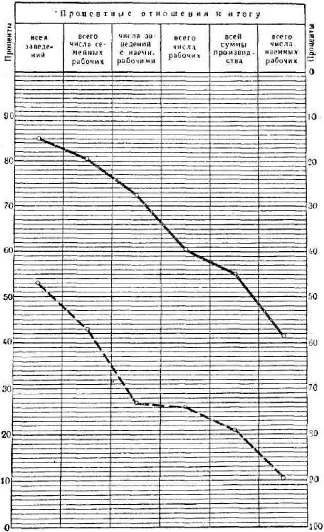 Пунктирная линия указывает в процентах (считая снизу) долю низшего, первого, разряда кустарей в общей сумме числа заведений, рабочих и т. д. по 33-м промыслам.